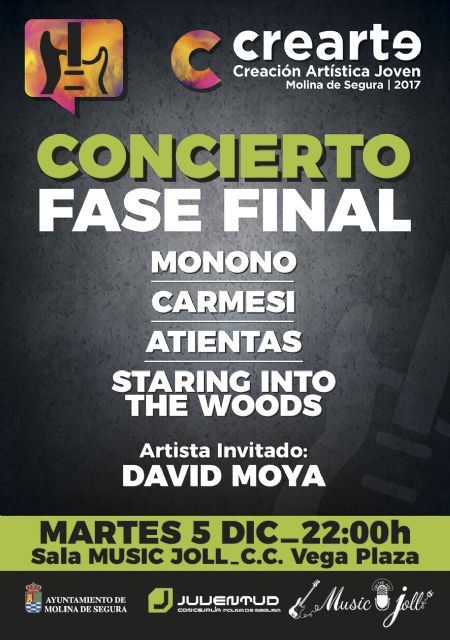 MONONO, ATIENTAS, STARING INTO THE WOOD y CARMESÍ son los finalistas de la modalidad de música del Certamen de Creación Artística Joven CREARTE 2017, organizado por la Concejalía de Juventud del Ayuntamiento de Molina de Segura con el fin de promocionar, apoyar y canalizar la labor creativa y cultural de los y las jóvenes.