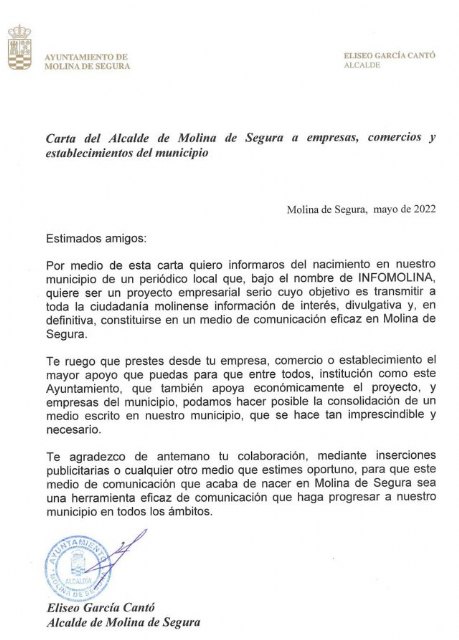 VOX denuncia la misiva enviada al empresariado local por el actual alcalde, firmada de su puño y letra, donde pide literalmente “colaboración mediante inserciones publicitarias o cualquier otro medio que estimes oportuno” a los mismos para ayudar al recién creado medio de comunicación “INFOMOLINA”; un periódico local cuyo contenido será supervisado meramente por personas municipales del PSOE y cuya financiación también correrá a cargo del ya castigado erario público, el cual carece de fondos para mejorar la limpieza, imagen e higiene de Molina de Segura, tal y como afirmó Eliseo García, en el Pleno Ordinario de ayer, pero sí para crear medios de comunicación, según apuntan a priori, todas las informaciones.