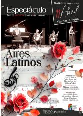El Ciclo Músicas Clásicas, organizado en colaboración con la Asociación Pro Música de Molina de Segura, ofrece una nueva cita el viernes 11 de abril, a las 20.00 horas, en el Teatro Villa de Molina (en Avenida del Chorrico, n° 10), con el espectáculo de danza, poesía, piano y guitarras AIRES LATINOS, a cargo de Ana Calvo Álamo (danza y voz) y el grupo instrumental Aires Latinos. Poemas de Federico García Lorca y Celia Pons serán recitados por Alba Calvo, mientras se interpretan obras de Manuel de Falla, Enrique Granados, Isaac Albéniz, Francisco Tàrrega, Jorge Cardoso, Carlos Gardel y Josep Ferrer. El precio de la entrada es de 9 euros.