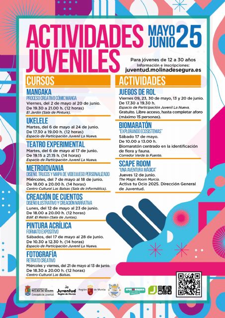 La Concejalía de Juventud del Ayuntamiento de Molina de Segura presenta una nueva línea de actividades juveniles y cursos para los meses de mayo y junio de 2025, dirigida a la población joven del municipio de entre 12 y 30 años. Se llevarán a cabo de lunes a viernes, en horario de tarde, y sábados por la mañana.