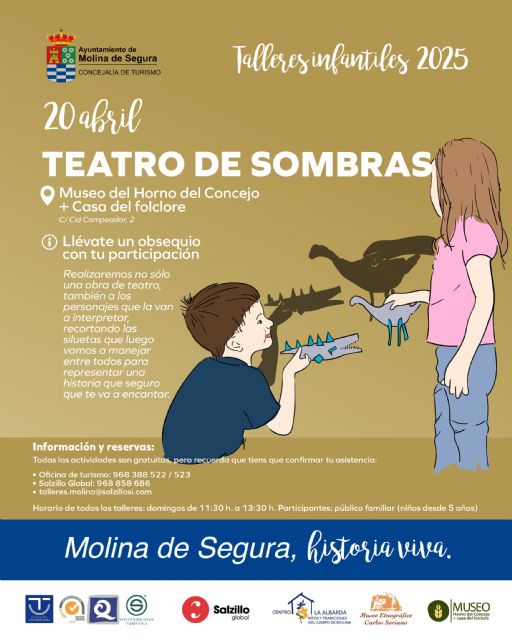 El Teatro de sombras, organizado por la Concejalía de Turismo del Ayuntamiento de Molina de Segura, se realiza el domingo 20 de abril, de 11.30 a 13.30 horas, en el en el Museo Horno del Concejo y Casa del Folclore (en Calle Cid Campeador, en Barrio del Castillo).