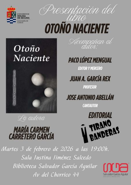 La presentación del poemario Otoño Naciente, obra de la autora María del Carmen Carretero, y publicado por la editorial Tirano Banderas, tendrá lugar el martes 3 de febrero, a las 19.00 horas, en el Salón de Actos Justina Jiménez Salcedo, en la Biblioteca Salvador García Aguilar (en Avenida del Chorrico, n° 44). Acompañará a la autora el mercero y editor del libro, Paco López Mengual, el profesor Juan Antonio García Rex, y actuará el cantautor José Antonio Abellán.