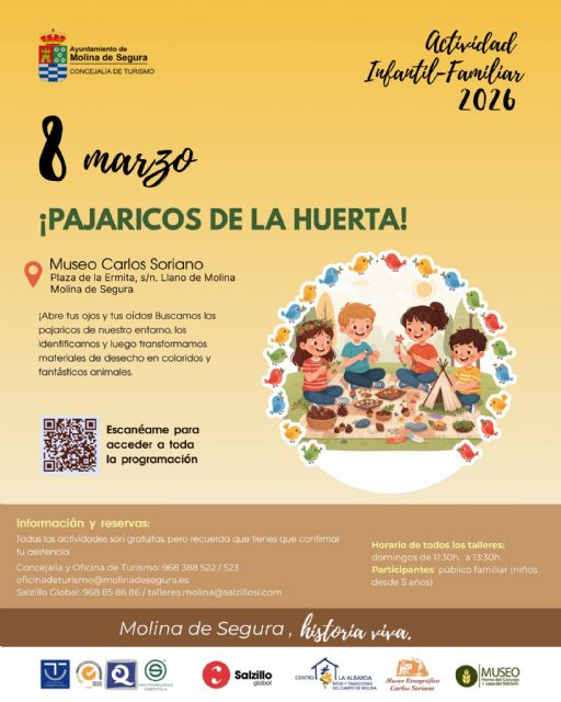 La actividad Pajaricos de la huerta, organizada por la Concejalía de Turismo del Ayuntamiento de Molina de Segura, se realiza el domingo 8 de marzo, de 11.30 a 13.30 horas, en el Museo Etnográfico Carlos Soriano de la pedanía El Llano de Molina.