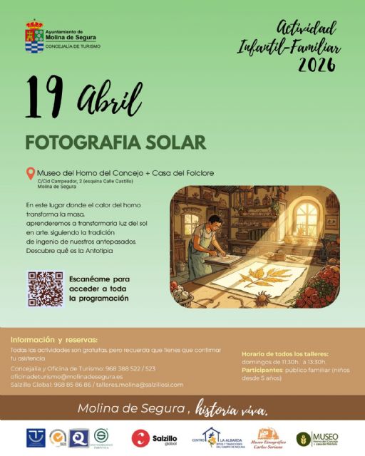 La actividad Fotografía solar, organizada por la Concejalía de Turismo del Ayuntamiento de Molina de Segura, se realiza el domingo 19 de abril, de 11.30 a 13.30 horas, en el Museo Horno del Concejo y Casa del Folclore (en Calle Cid Campeador, n° 2, en Barrio del Castillo).