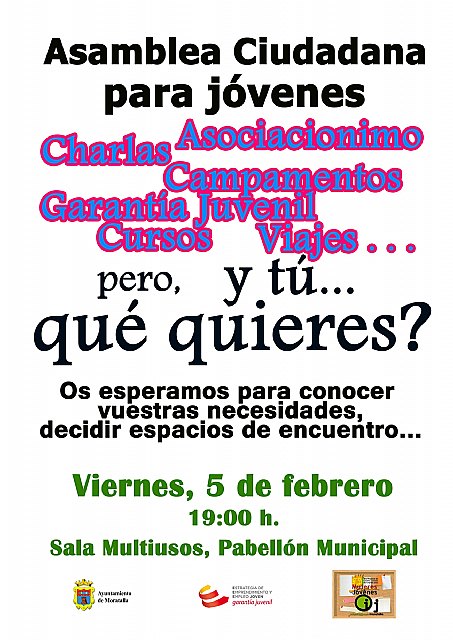 Dentro de las acciones que el Ayuntamiento de Moratalla esta llevando a cabo para fomentar la participación de la ciudadanía, se ha convocado una Asamblea Ciudadana para Jóvenes el próximo 5 de febrero a las 19:00 h. en la Sala Multiusos del Pabellón Municipal.