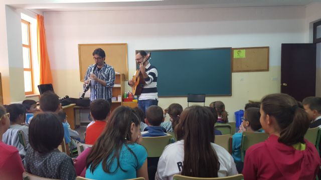 Los coordinadores de la Escuela Municipal de Música de Moratalla Miguel Verdú y Manuel Gómez, junto con la Concejala de Educación del Ayuntamiento de Moratalla Juana María Abellán, visitan los Colegios de Benizar y Sabinar.