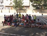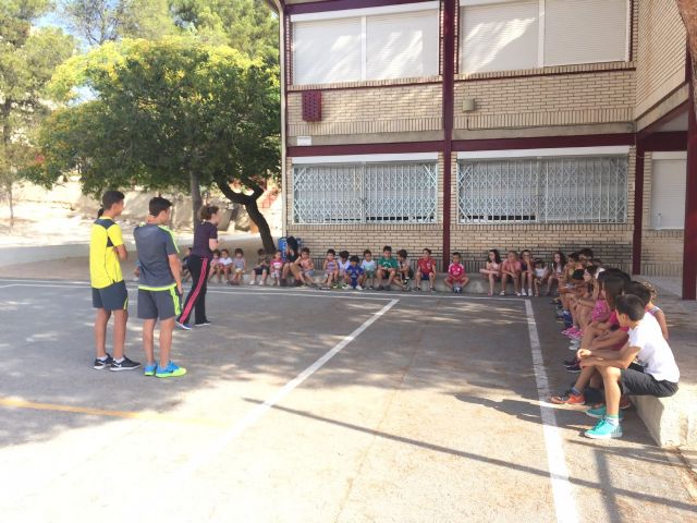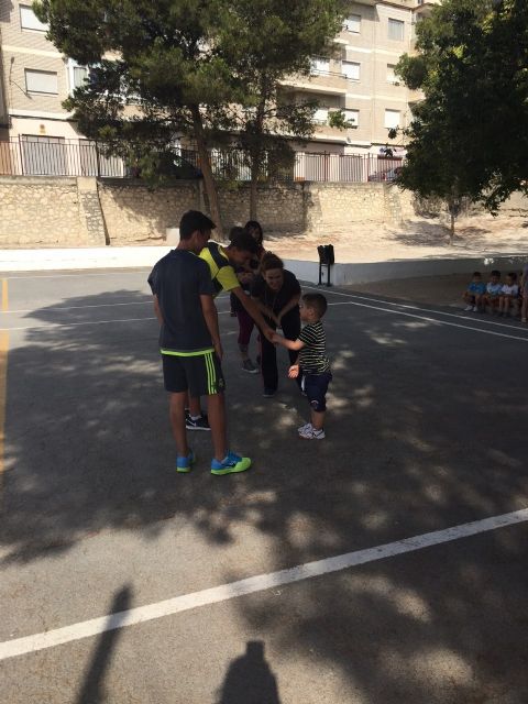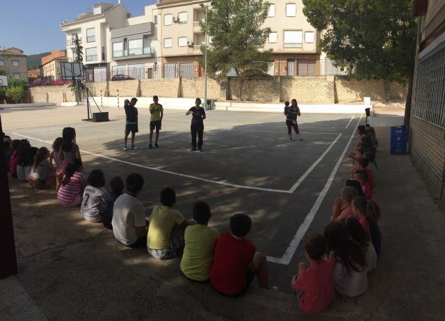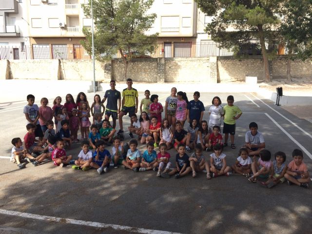 Alberto y Sergio, les contaron que eran de Moratalla, que habían ido al mismo colegio donde se estaba realizando la escuela de verano y que cuando eran pequeños también acudieron a este servicio organizado por el Ayuntamiento de Moratalla. Además, hicieron una pequeña demostración de sus habilidades futbolísticas mientas que los niños/as les animaban.