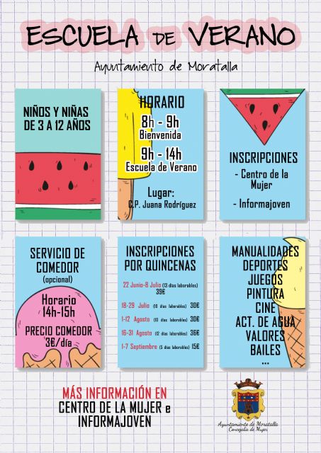 El Ayuntamiento de Moratalla ofrece el servicio de conciliación familiar y laboral "Escuela de Verano" desde el mes de junio. Dicho servicio inició al finalizar el período escolar y continuará hasta el siete de septiembre.