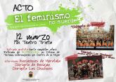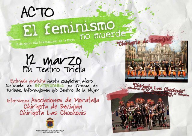 Como acto de cierre de campaña, que no de lucha, el día 12 de marzo se realizará una jornada de convivencia y el acto "El feminismo no muerde" en el Teatro Trieta de Moratalla. Acto en el que participarán diferentes colectivos y/o asociaciones exponiendo a través de sus testimonios cómo han aportado su granito de arena en la lucha por la igualdad. También contaremos con la participación de dos chirigotas, la "Chirigota de Beniaján" y la chirigota "Las Chochonis", estas últimas ganadoras del XV Concurso Regional de Chirigotas Ciudad de Cartagena 2017. La entrada al acto es gratuita. Las personas interesadas en acudir al acto pueden recoger su invitación en Oficina de Turismo, Centro de la Mujer y/o Informajoven.