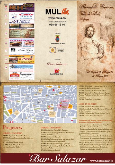 Los Próximos días 17, 18 y 19 tendrá lugar en Mula la celebración de un Mercadillo de ambientación Barroca en los aledaños del Convento de San Francisco y la Calle del Caño. Casi de un centenar de artesanos vendrán de todas partes a vender sus más lujosas mercancías. Se podrán ver también a nobles damas, temibles bandoleros, ilustres frailes, poderosos marqueses y piadosas monjas que te trasladarán a una de las épocas más ricas y apasionantes de nuestra historia. Pasacalles, malabares, actividades infantiles, visitas guiadas al patrimonio dieciochesco de Mula y un concurso de disfraces de época serán algunas de las actividades que se concentrarán en Mula estos días. La Asociación de Artesanos de "Las 4 Plazas" y el Ayuntamiento de Mula organizan este mercado junto con la colaboración de restaurantes, artesanos y otras asociaciones y entidades del municipio.