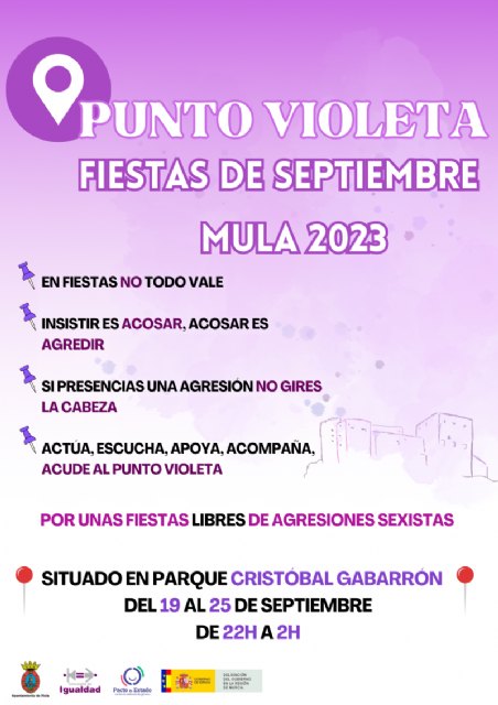 La concejala de Igualdad, Ana Belén Pérez, explica que el Punto Violeta «se sitúa en un lugar céntrico y accesible, donde contaremos con personal especializado de la Asociación de Mujeres Jóvenes de la Región de Murcia, para la prevención de posibles situaciones de agresión sexista, su atención y actuación, en caso que fuera necesario». Además, contará con material informativo para cualquier persona que lo desee ya que, como explica la concejala, «su finalidad es garantizar que todas las muleñas y muleños disfrutemos de las fiestas en su totalidad».