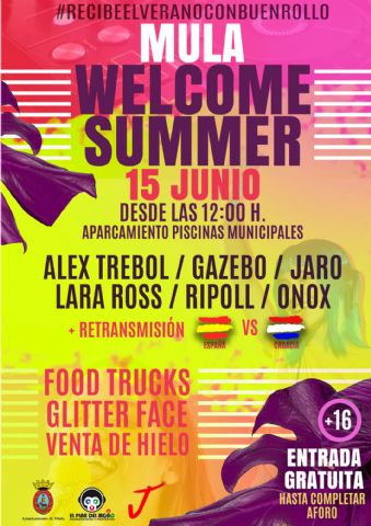 El Ayuntamiento de Mula, a través de la concejalía de Juventud, y en colaboración con El Plan del Mono, presenta el festival «Mula Welcome Summer», que tendrá lugar el próximo 15 de junio a partir de las 12:00 horas en el aparcamiento de las piscinas municipales de Mula para los mayores de 16 años.