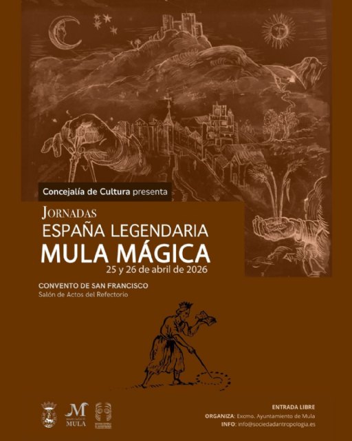 La concejalía de Cultura del Ayuntamiento de Mula anuncia la celebración de las Jornadas “España Legendaria: Mula Mágica”, que tendrán lugar los días 25 y 26 de abril de 2026 en el Convento de San Francisco, en el Salón de Actos del Refectorio, con entrada libre.