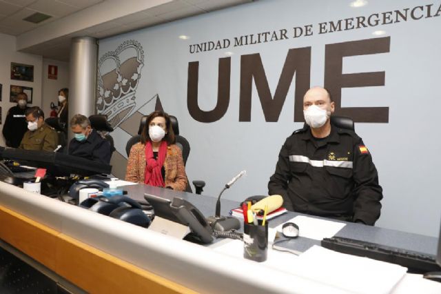 A su llegada y tras ser recibida por el teniente general Luis Manuel Martínez, la ministra ha asistido a un Punto de Situación en la Sala Histórica del Cuartel General, donde se han expuesto los detalles de las acciones que ha llevado a cabo la UME hasta el momento, así como el actual despliegue de las diferentes unidades por todo el territorio nacional y las posibles acciones de futuro.
