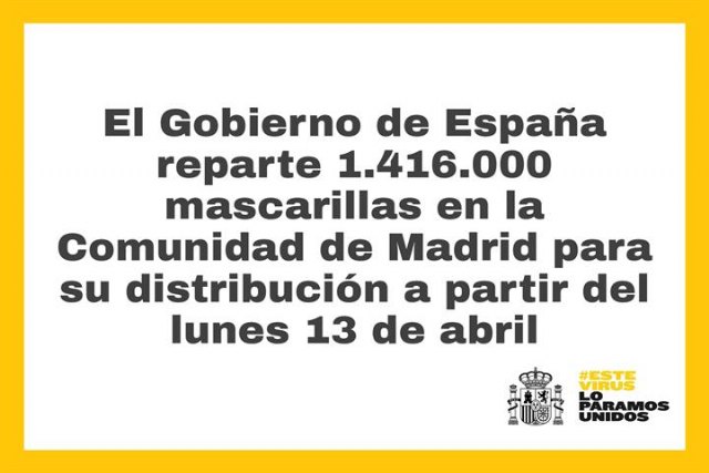 El Gobierno de España ha entregado en la Comunidad de Madrid un total de 1.416.000 mascarillas que empezarán a distribuirse a partir de mañana en los principales puntos de la Comunidad Autónoma para aquellas personas que tengan que desplazarse para trabajar y sea más complejo mantener la distancia de seguridad.
