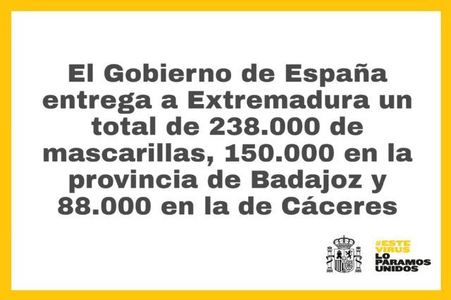 El Gobierno de España ha entregado a Extremadura un total de 238.000 de mascarillas, 150.000 en la provincia de Badajoz y 88.000 en la de Cáceres, que empezarán a distribuirse a partir de mañana en los principales puntos de la Comunidad Autónoma para aquellas personas que tengan que desplazarse a trabajar y sea más complejo mantener la distancia de seguridad.