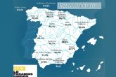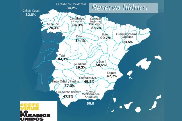 La reserva hídrica española está al 64 por ciento de su capacidad total. Los embalses almacenan actualmente 35.586 hectómetros cúbicos (hm³) de agua, disminuyendo en la última semana en 606 hectómetros cúbicos (el 1,1 por ciento de la capacidad total actual de los embalses).