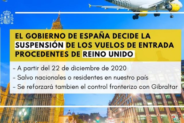 El Gobierno decide, de manera concertada con Portugal, la suspensión de vuelos de entrada procedentes del Reino Unido desde mañana, salvo para ciudadanos españoles o residentes. Se reforzará también el control fronterizo en Gibraltar