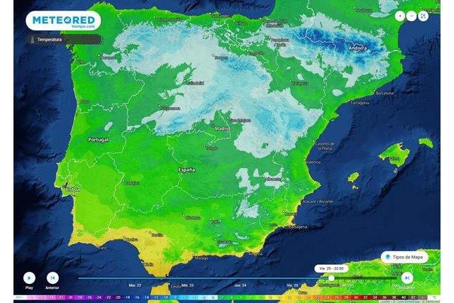Las temperaturas descenderán drásticamente, con fuertes heladas en la mitad norte y muchas regiones de la mitad sur. Cuando caiga la noche, las temperaturas bajarán de los 0° C en capitales como León, Burgos, Huesca, Teruel, Cuenca o Segovia. En las últimas horas del día habrá que ir con mucha precaución en las carreteras debido a las posibles placas de hielo.