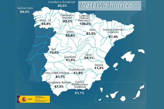 La reserva hídrica española está al 64,4 por ciento de su capacidad total. Los embalses almacenan actualmente 36.018 hectómetros cúbicos (hm³) de agua, aumentando en la última semana en 27 hectómetros cúbicos (el 0,0 por ciento de la capacidad total actual de los embalses).