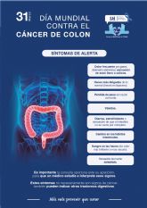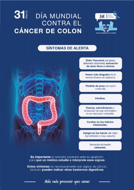 El Sindicato de Técnicos de Enfermería (SAE) se suma al Día Mundial contra el Cáncer de Colon con un cartel en el que se recogen los principales síntomas de esta patología, que afecta a ambos sexos y cuyo principal factor de riesgo es la edad.