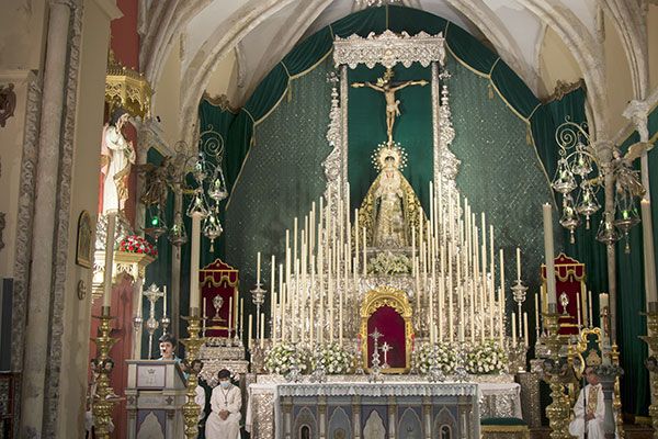 Al gran aparato de ceras y flores que compone el majestuoso altar de cultos, que hay que añadir una cuidada ceremonia desde el punto de vista litúrgico, como la celebración diaria de la Santa Misa, en la que el oficiante, el Rdo. José Francisco Duran Falcón, predica la Palabra de Dios y en la que la Hermandad pone sobre su altar a modo de ofrenda, la vida y el trabajo de todo un año. Remata la composición una gran lámpara de cristal y bronce, que data de 1967 y sustituía a la antigua de cristal de bohemia, muy valiosa, de primeros del siglo XX.