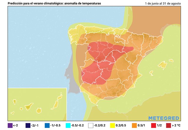 Según el modelo de Meteored, la dorsal anticiclónica estará centrada sobre la vertical peninsular, lo que podría generar irrupciones de aire tropical continental procedente de África. Además, la Península Ibérica fabrica su propio calor al funcionar como un "minicontinente", por lo que el ambiente podría ser sofocante con vientos de componente sur y este. Con estas condiciones previsiblemente tendremos algunas olas de calor intensas con mayor duración de lo habitual.