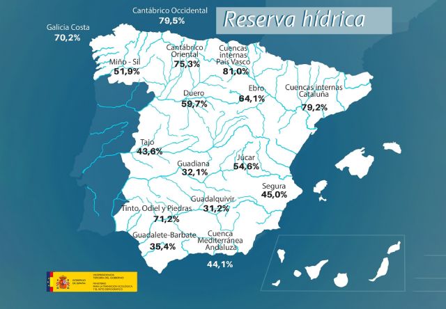 La reserva hídrica española está al 47,0 por ciento de su capacidad total. Los embalses almacenan actualmente 26.290 hectómetros cúbicos (hm³) de agua, disminuyendo en la última semana en 802 hectómetros cúbicos (el 1,4 por ciento de la capacidad total actual de los embalses).