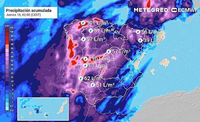 Como consecuencia de ese fenómeno orográfico, se acumularán muchos litros entre el norte de Extremadura y el sur de Castilla y León. En zonas como el Valle del Jerte, Las Hurdes o la Sierra de Gata, en Extremadura, se podrían acumular más de 100 litros por metro cuadrado.