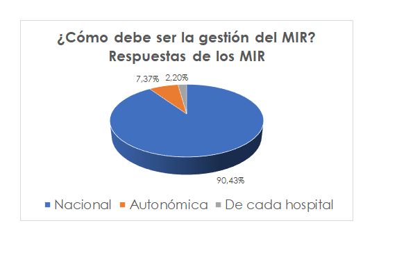 En lo referente a los datos globales (teniendo en cuenta las respuestas independientemente de si son de MIR o de especialistas), el93,4% cree que la gestión debe ser nacional,el 4,7% autonómico y el 1,9% de cada hospital.