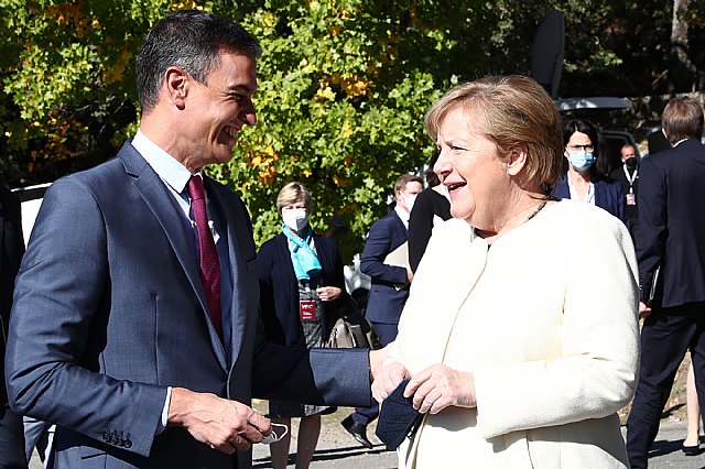 Pedro Sánchez ha asistido en el Real Monasterio de Yuste (Cáceres) a la entrega del XIV Premio Europeo Carlos V a la canciller de la República Federal de Alemania, Angela Merkel, acto presidido por el Rey Felipe VI y al que también ha acudido el ministro de Asuntos Exteriores, Unión Europea y Cooperación, José Manuel Albares.