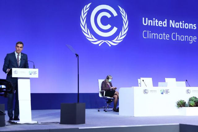 El presidente del Gobierno, Pedro Sánchez, ha participado hoy en la primera sesión plenaria de intervenciones de jefes de Estado y de Gobierno de la 26º edición de la Conferencia de Naciones Unidas sobre Cambio Climático (COP26).
