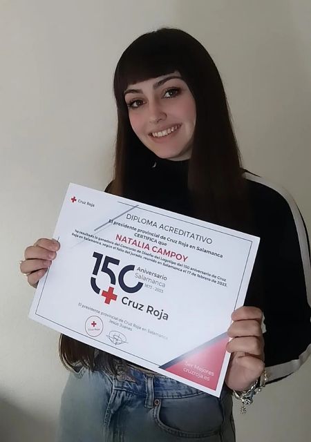 Natalia Campoy, de 22 años, natural de Lorca (Murcia) y estudiante de cuarto curso de Diseño Gráfico en la Escuela Superior de Diseño de Murcia, se ha alzado como ganadora del Concurso de Diseño del logotipo del 150 aniversario de Cruz Roja en Salamanca. Su creatividad, con el lema "Unidad", será la imagen representativa de los actos y eventos que desarrollará la institución humanitaria a lo largo de este 2023 en Salamanca para conmemorar la acción humanitaria desde 1873. Así lo falló el jurado, compuesto por el Consejo de Dirección de Cruz Roja en Salamanca, reunido el pasado 17 de febrero.