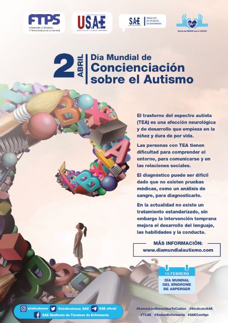 El Sindicato de Técnicos de Enfermería (SAE) se suma un año más al Día Mundial de la Concienciación sobre el Autismo con el objetivo de visibilizar los problemas diarios a los que se enfrentan las personas con Trastorno del Espectro del Autismo (TEA) e informar a la población sobre esta patología para acabar con el estigma que la rodea.