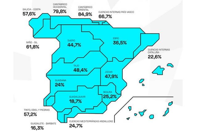 La reserva hídrica española está al 36,8 por ciento de su capacidad total. Los embalses almacenan actualmente 20.623 hectómetros cúbicos (hm³) de agua, disminuye en la última semana en 111 hectómetros cúbicos (el 0,2 por ciento de la capacidad total actual de los embalses).