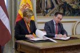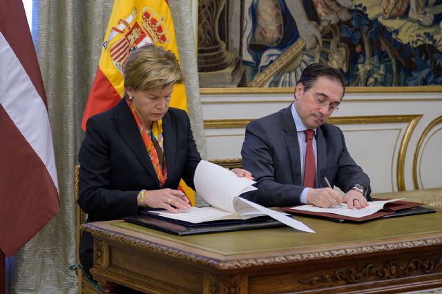 El ministro José Manuel Albares junto a la ministra letona de Exteriores, Baiba Braže, durante la firma del Memorando de Entendimiento.