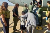 En la Base Aérea de Zaragoza, la ministra de Sanidad, Mónica García, saluda a los menores, que vienen junto a sus familiares y son derivados a hospitales de Catalunya, Euskadi, Navarra y Asturias, en una operación respaldada por varios ministerios.