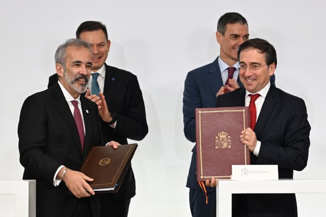 El ministro de Asuntos Exteriores, Unión Europea y Cooperación, José Manuel Albares, y su homólogo portugués, el ministro de Estado y Negocios Extranjeros de Portugal, Paulo Rangel, durante la firma del acuerdo bilateral. (Foto: Moncloa / Borja Puig de la Bellacasa)