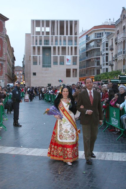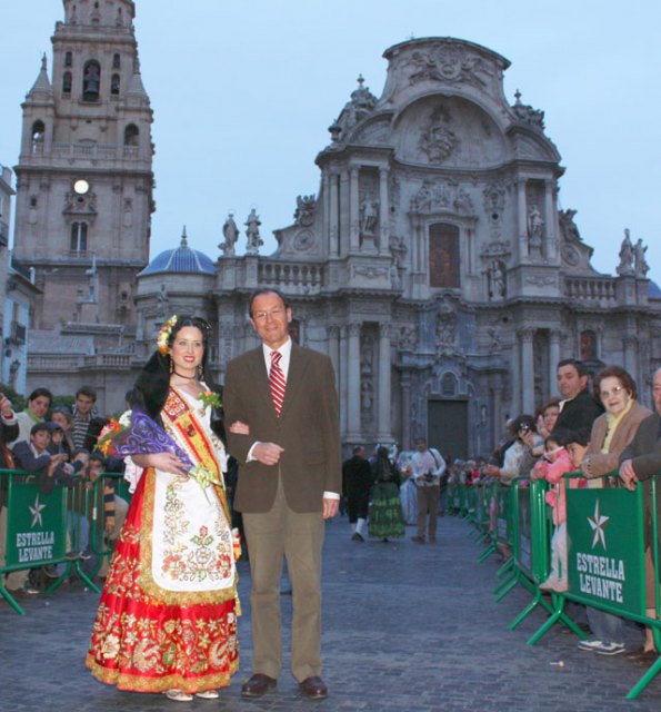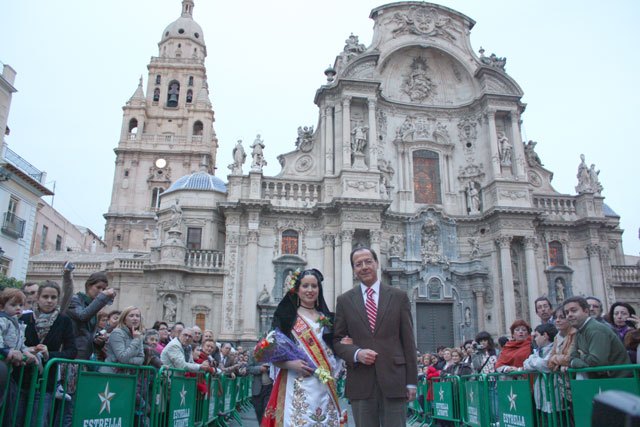 El Alcalde, Miguel Ángel Cámara, llevando del brazo a la Reina de la Huerta, María Pilar Moreno, ha abierto esta tarde el cortejo de representación del Ayuntamiento que, desde La Glorieta, se dirigió a La Catedral para realizar la tradicional ofrenda floral a la Virgen de la Fuensanta, Patrona de la Ciudad.