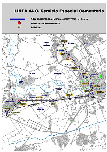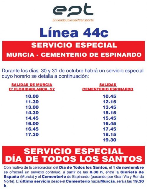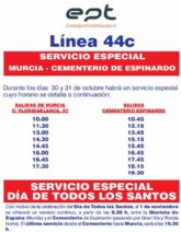 Por su parte, la línea 44C mantiene su habitual recorrido y horarios con salida en Alcantarilla y paso por Murcia hasta el cementerio. Las salidas para el día de hoy desde el municipio alcantarillero son a las 14:30 y 16:30 horas, y el regreso a las 15:45 y 17:45 horas. Para mañana y el lunes, las salidas serán a las 9:50, 11:50, 14:50 y 16:45 horas, y los retornos a las 10:50, 12:50, 15:50 y 17:45 horas.