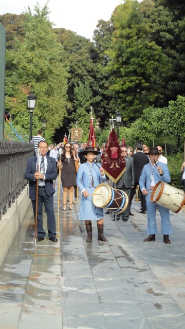 La procesión con el Simpecado, máxima representación de la Hermandad del Rocío, dio comienzo a las 11.30 abriendo el cortejo los tamborileos seguidos de todos los estandartes, varas y Hermandades y unos 100 hermanos.