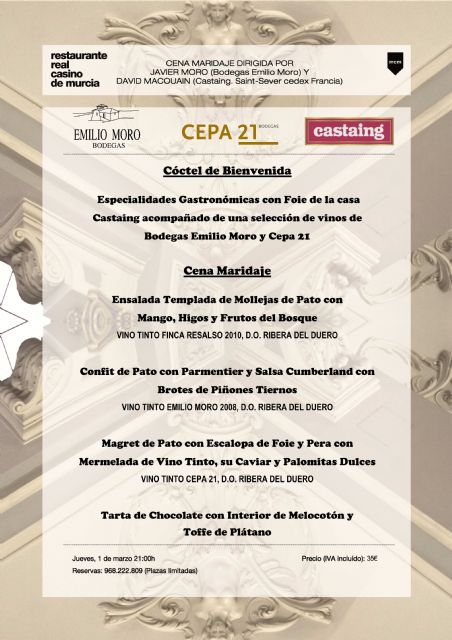 El Restaurante del Real Casino de Murcia (RRCM) celebrará el próximo jueves 1 de marzo a partir de las 21 horas una cena-maridaje con las bodegas de la D.O. Ribera del Duero Emilio Moro y Cepa 21.