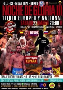 El próximo 22 de Marzo los aficionados a la lucha tienen una cita en Sangonera la Verde. Por tercer año consecutivo el Campeonato Nacional 'Noche de Gloria' elige la pedanía murciana para enfrentar en el ring a los competidores de las categorías full, K1, Muay Tthay y como novedad este año el boxeo.