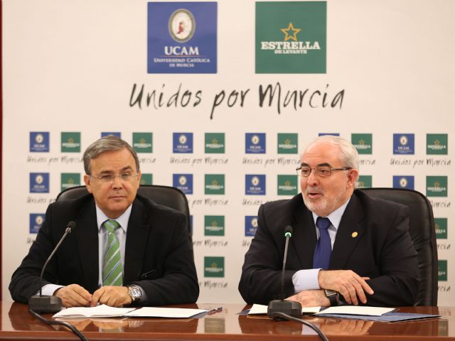 La Universidad Católica San Antonio de Murcia (UCAM) y Estrella de Levante han firmado un convenio de colaboración que une a ambas entidades murcianas en aspectos tan diversos como la investigación, la docencia o el deporte. Entre otras cosas, se va a materializar en la creación de una Cátedra Internacional de Investigación en el ámbito de la Gastronomía, dirigida por Patricio Valverde, o en el patrocinio por parte de la empresa cervecera del UCAM Murcia CB de la Liga Endesa. Además, se va a trabajar en la posible puesta en marcha en el futuro de la Formación Profesional Dual entre ambas entidades. José Luis Mendoza, presidente de la UCAM, y Patricio Valverde, director general de Estrella de Levante, han firmado esta mañana el acuerdo en la Sala Capitular del Monasterio de los Jerónimos.