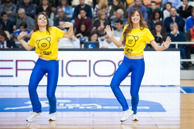 Además, durante los tiempos muertos, las cheerleaders del UCAM Murcia CB regalaron camisetas al público que asistió al Palacio de los Deportes.