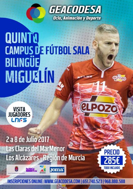 El capitán e internacional de ElPozo Murcia FS, Miguel Sayago Martí 'Miguelín, junto al gerente de Geocadesa gestión deportiva, Antonio Legido, presentaron la quinta edición del Campus de Fútbol Sala Bilingüe Miguelín y que se desarrollará en la localidad del Mar Menor de Los Alcázares del 2 al 8 de Julio. Dirigido a niños y niñas desde 6 años a jóvenes de 18 años.