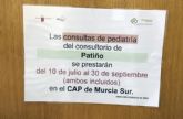 Respecto a las consultas de pediatría, la formación naranja se ha hecho eco de la denuncia de la Junta Municipal de Patiño, presidida por el pedáneo de Ciudadanos, Antonio Jiménez. Y es que el consultorio de esta pedanía se ha quedado sin el servicio de pediatría durante los tres meses de verano -como viene siendo habitual en los últimos tiempos- a pesar de que este año, casi 700 vecinos presentaron un escrito a la consejería de Sanidad reclamando que no lo eliminara al cien por cien, pudiendo dejar que este servicio se prestara durante media jornada en el consultorio de Patiño, y la otra media en el centro de salud de Ronda Sur, evitando que todos los usuarios tuvieran que desplazarse hasta este último de forma obligatoria.