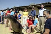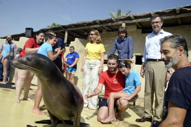 El alcalde de Murcia, José Ballesta, junto a los concejales de Modernización de la Administración, José Guillén, y Derechos Sociales, Conchita Ruiz, visitó hoy la Escuela de Verano Adaptada de Terra Natura, en la que medio centenar de niños con discapacidad tienen la oportunidad de practicar la zooterapia con leones marinos y otros animales como perros, lémures, jirafas, rapaces o gamos.