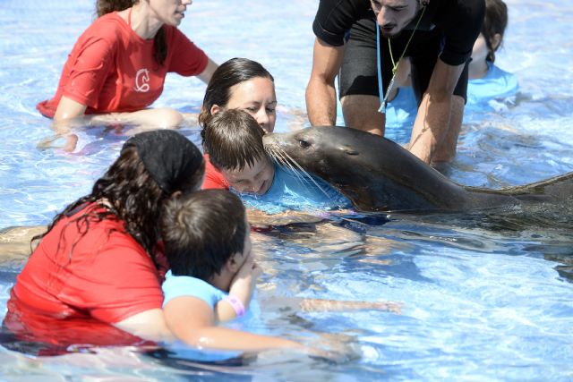 Hoy se han sumado a la Escuela de Verano dos personas con discapacidad pertenecientes a familias en situación de vulnerabilidad, gracias a dos becas ofrecidas por el Ayuntamiento de Murcia. Ambos jóvenes, acompañados por el resto de sus compañeros, han participado por primera vez en la terapia con leones marinos en un entorno natural y desde un enfoque lúdico-educativo