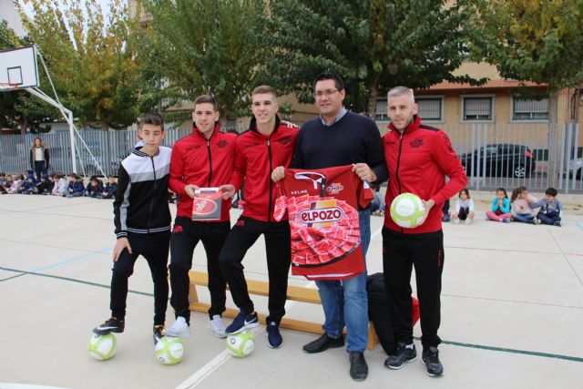 Los jugadores de ElPozo Murcia FS, Miguelín, Fernando y Alberto García del filial, han compartido esta mañana una grata jornada con los escolares de Primaria del CEIP Infanta Cristina de Puente Tocinos pese a la lluvia. Acompañados de Germán, jugador de las Bases de ElPozo Murcia y ex alumnos del centro. Y en el encuentro ante Palma Futsal- de este sábado en el Palacio-dos alumnos seleccionados por el centro escolar vivirán un partido mágico con su equipo y desde dentro.